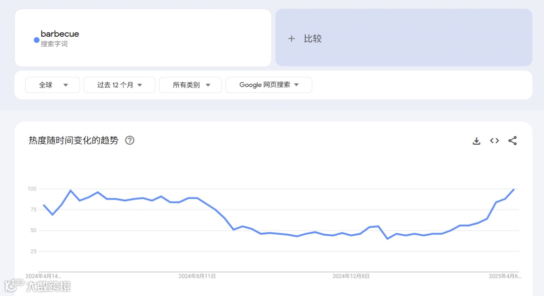 谷歌趋势数据显示,过去一年,“barbecue(烧烤)”一词全球范围内搜索热度持续在40—100之间,从往年的4月份开始,搜索热度逐渐上到60+,法国、意大利、美国、比利时、荷兰、英国等为主要关注者。