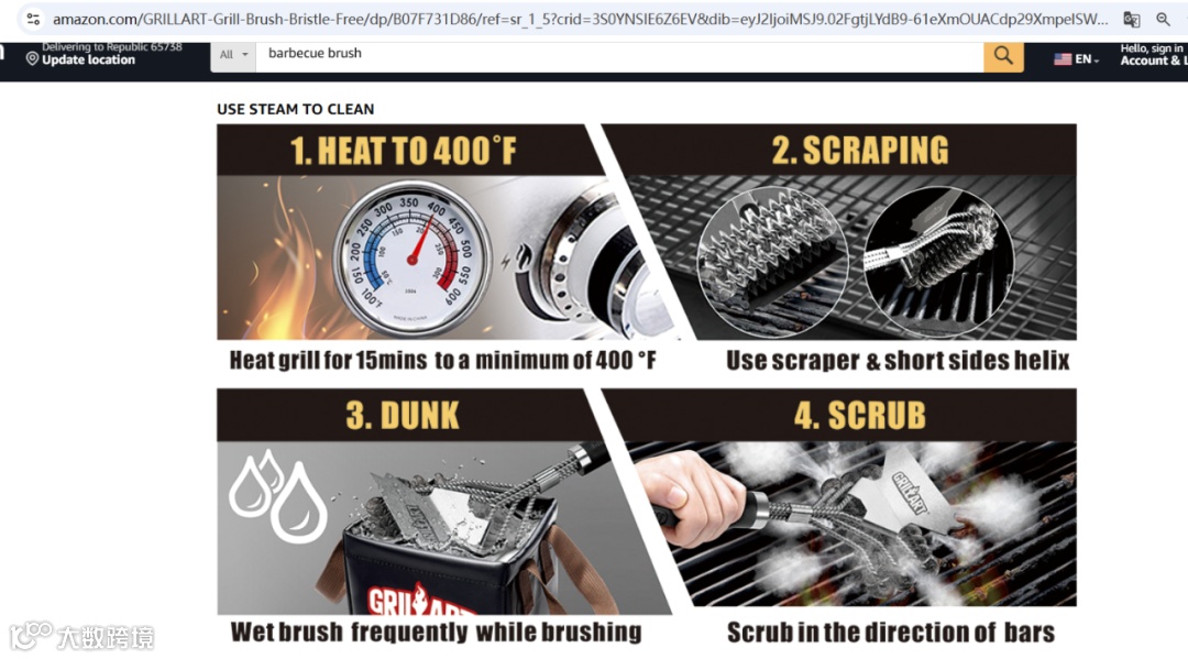 视频中达人不仅展示烧烤过程,通过特写镜头展示烧烤刷的清洁过程,这种“被动种草效应”推动亚马逊上烧烤刷搜索量激增。
