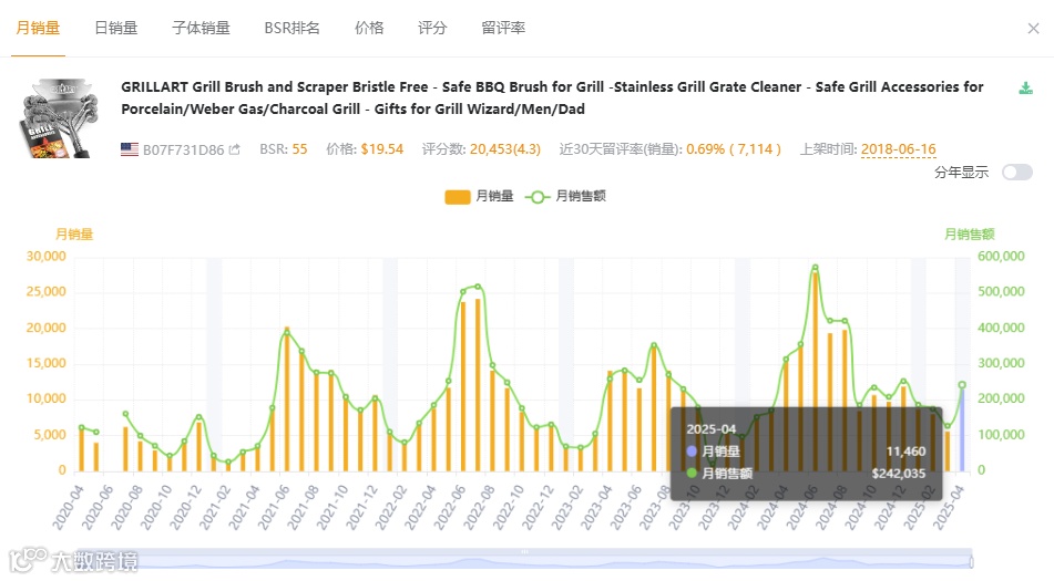 卖家精灵数据显示,Amazon美国站一款烧烤刷产品销量可观,短短14天内销量达11460单,销售额超24万美元,位列该品类热销榜首。