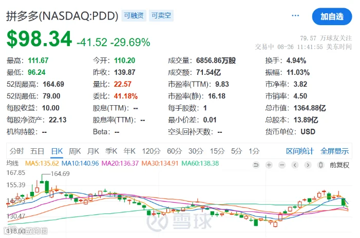 因此在财报公布后,拼多多美股开盘暴跌近30%,每股跌至100美元以下。这是该股自2018年首次公开募股以来的最大跌幅。