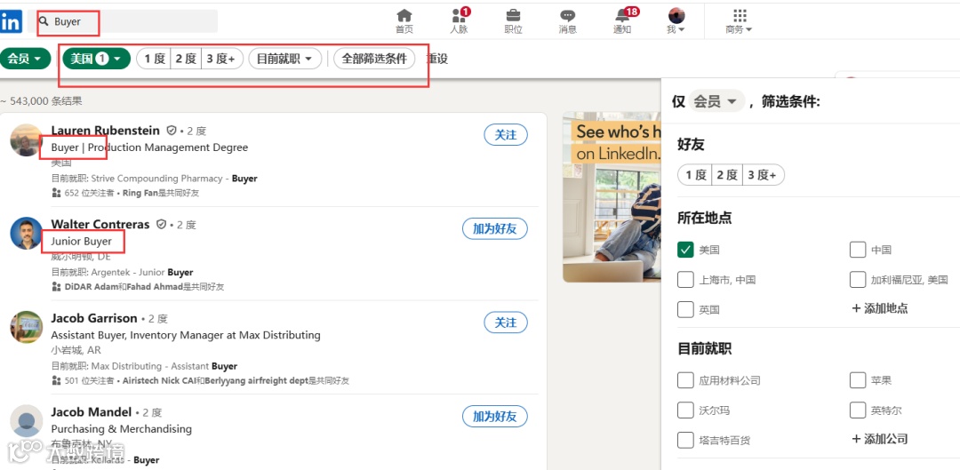 当然了关键词搜索这个是最简单的用法,如果你知道客户公司名字、客户的名字的话,也可以直接到领英去搜索,有机会能搜索到客户的联系方式,而且领英本身就是一个可以在线沟通交流的平台,可以加好友。