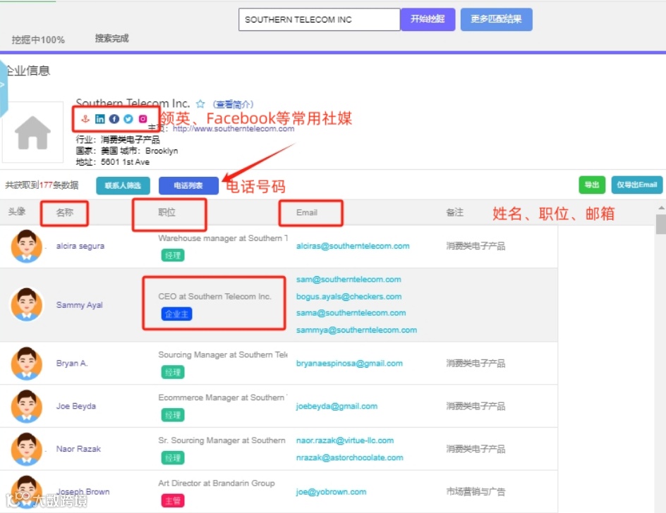 这个工具集合了目前大部分的主流获取客户联系方式的方法,比如谷歌、社媒、大数据等等,还是非常全面的。通过这个工具可以直接搜索到客户的职位、姓名、社媒和电话等信息去联系,非常的实用。