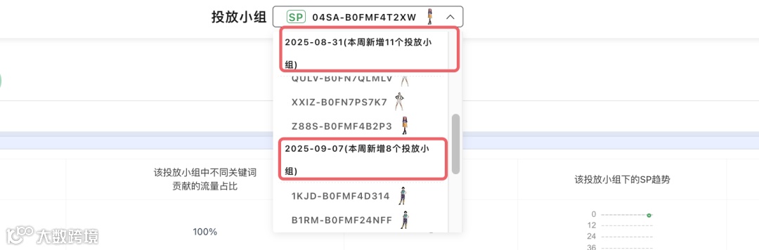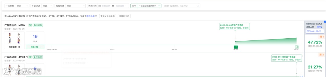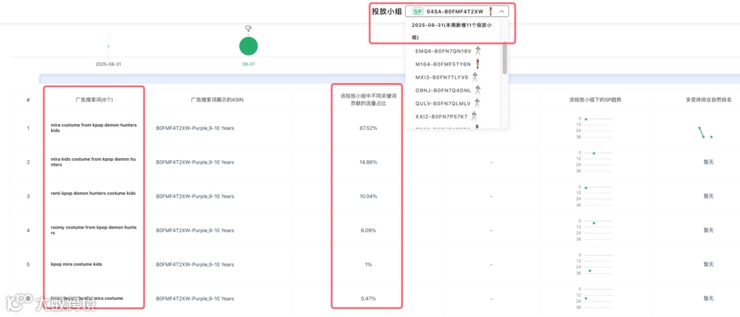 2.查看45ZO这个投放小组可以发现8月31日的广告搜索词只有3个,而到了9月7日就有23个广告搜索词。并且可以通过词根判断这小组的匹配方式是自动或广泛。通过该投放小组中不同关键词贡献的流量占比可知rumi costume的权重最高,9月7日的时候广告位在首页的第二位。如此一来就可以在如此多的广告搜索词中找到权重最高的关键词,如果学习复制的话,就更加直接高效。