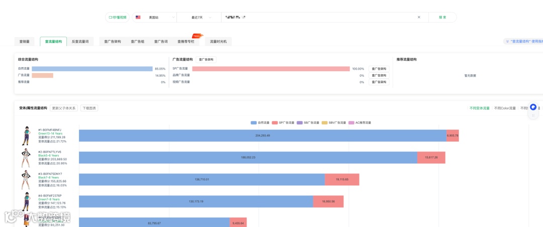 使用Sif关键词查询流量结构,最近7天自然流量85%,SP广告流量15%