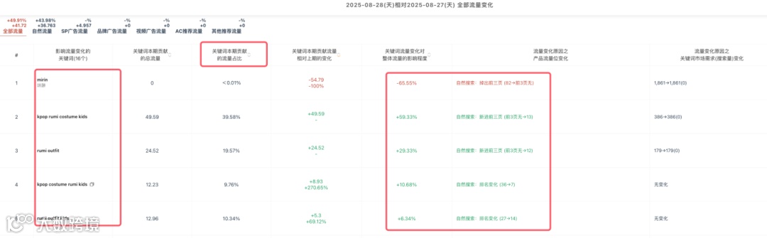 该功能还可以了解产品的流量变化历史和洞察引起变化的具体原因。点击8月28日的全部流量词可以看到流量词中都是带Rumi这个电影角色,引起流量变化是自然排名的提升。