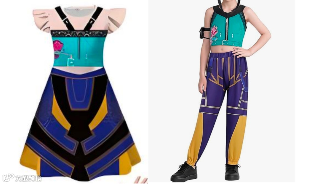 左边电影造型,右边是产品。如果熟悉电影中角色的消费者,很快可以把服装与角色对应起来。但是实际上差异点太多。随便就可以提出好多,比如短袖改无袖,裙子改长裤,图案也都不同。