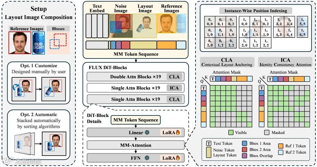 身份一致性注意力 (Identity Consistency Attention, ICA): 部署在 DiT 的中间层,专注于高频的细粒度身份信息。ICA 通过隔离式注意力掩码,让待去噪图像中的实例区域 Token 只参考其对应的参考图像 Token,保障多主体身份高保真、不混淆地注入生成过程中。