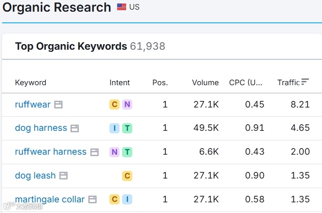 自然关键词数量接近 6.2 万,SEO 覆盖面广,品牌词和核心品类词几乎全部排名第 1(如 dog harness、dog leash),既能承接购买型搜索,也能获取大量泛需求用户。通过自然搜索获得高质量流量,对广告依赖度低。