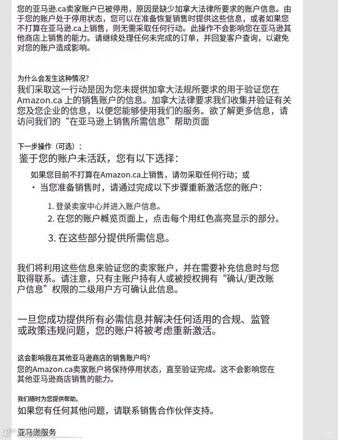 近期,大量巴西站、加拿大站卖家账户被亚马逊集中停用。平台邮件提示:“因账户长期未活跃,需完成账户信息验证。”