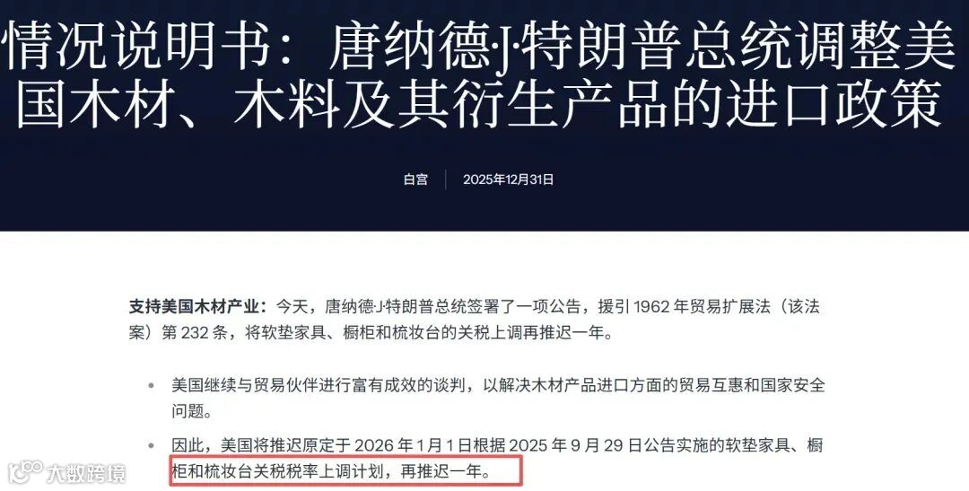 2025年9月,特朗普下令对厨房橱柜和软体家具加征25%新关税,并于10月起执行。按原计划,2026年厨房橱柜关税将升至50%,软体家具升至30%;此次推迟意味着现行25%税率暂不调整。