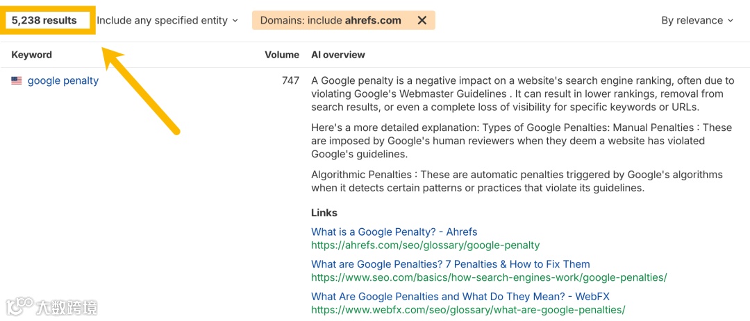 例如,Ahrefs有超过19,000个关键词在AI概览中触发且排名前十。 进一步使用Brand Radar等AI可视化工具,可筛选出包含你网站链接的AI概览内容: