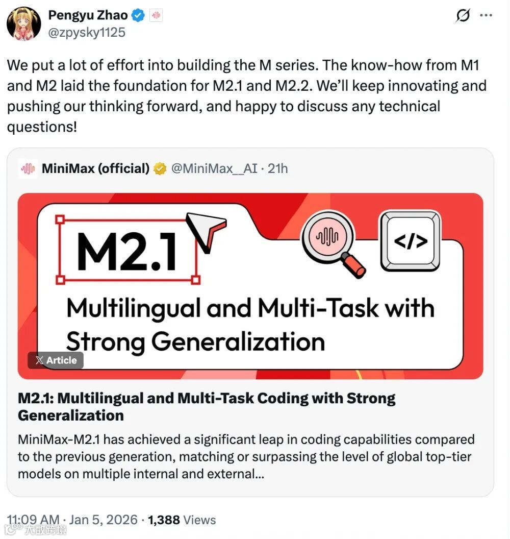 MiniMax近期开源模型M2.1专为代理场景优化。赵鹏宇在X平台发文称:“我们在M系列产品的研发上投入了大量精力。M1和M2的经验为M2.1和M2.2的研发奠定了基础。我们将继续创新,不断突破。”