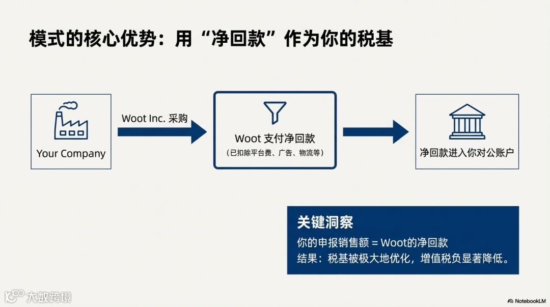 这里有一个最关键的好处:Woot跟你结算的钱,是扣除了所有成本之后的净回款。你用这个金额,跟税务局去申报,你的销售额是不是一下子就降下来了?你的税基,是不是就优化了?