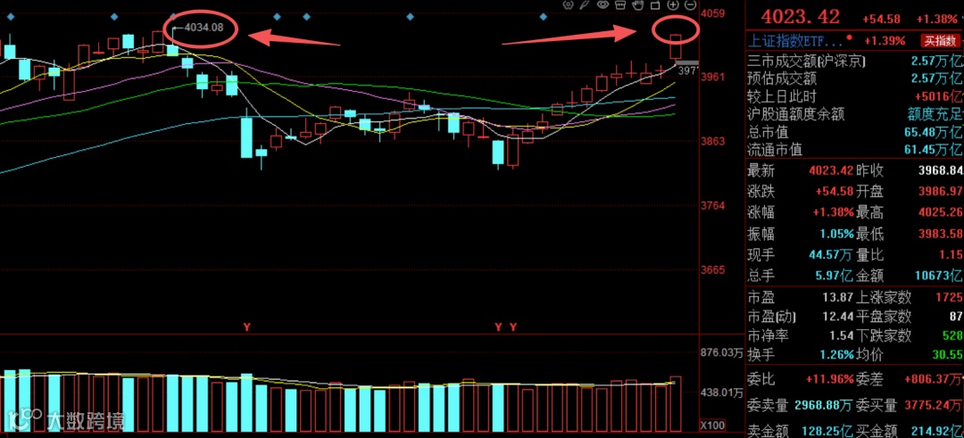 沪指重回4000点上方,达到4023.42点,完成历史首次十二连阳,沪深两市成交额高达2.55万亿,单日放量5011亿。