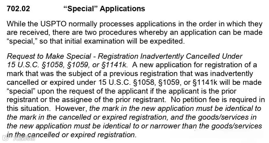 如果申请人之前的商标注册由于未在截止日期前提交注册后维护文件而被无意中取消或过期,可向USPTO提交特殊请求申请加速审查,需满足的条件: