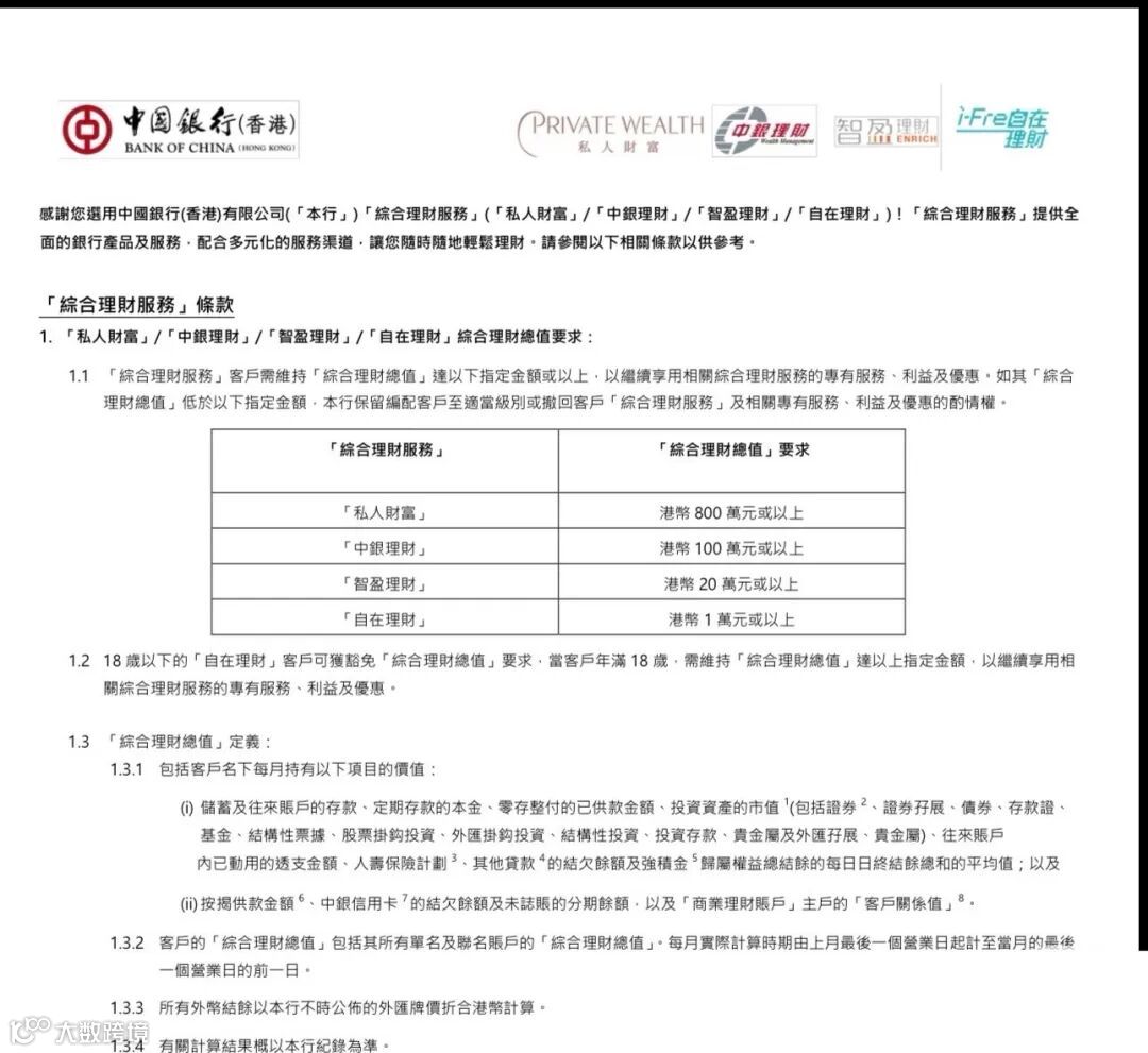 1. 👑 私人财富 : 需维持 800万港币 或以上。