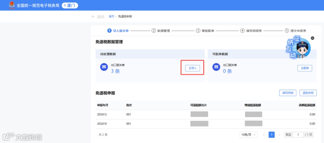 进入该功能菜单后,页面上方展示当前系统内待处理报关单条数和可配单报关单条数,页面下方展示申报年月、批次、可退税额合计、增值税退税额和消费税退税额。