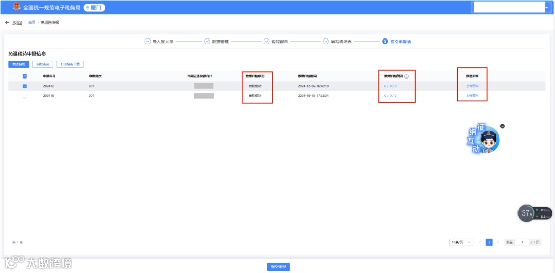 勾选数据,点击【提交申报】按钮,可上传至系统,完成申报。