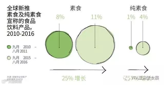 2015年9月-2016年8月,打着“素食”和“纯素食”概念的产品数量,比五年前各自增加了25%和257%。