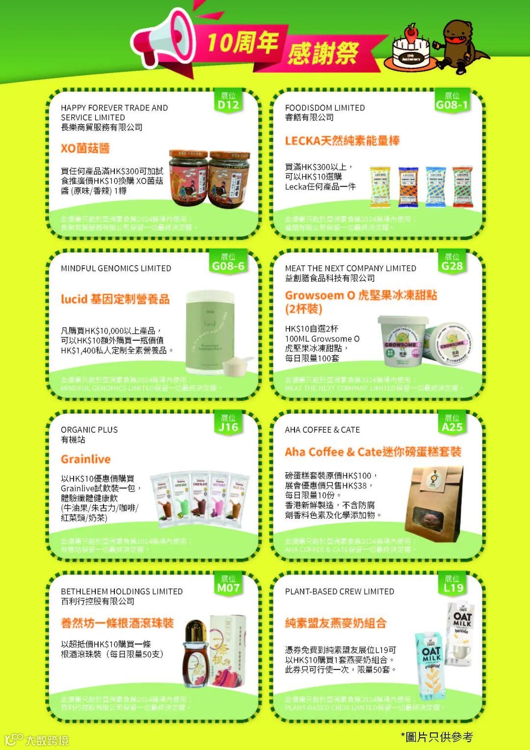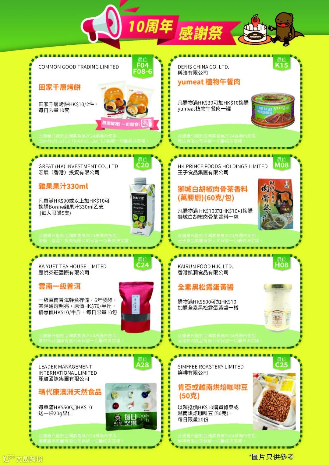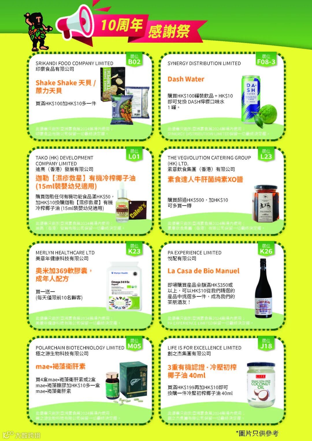 👏为庆祝亚洲素食展10周年,无论是10月出生、每月10号的生日,或证件含有「10」两个数字相连的观众,均可免费入场!现场购买$25素食展门票的入场人士,可获赠价值HK$100德国制环保餐具一套。