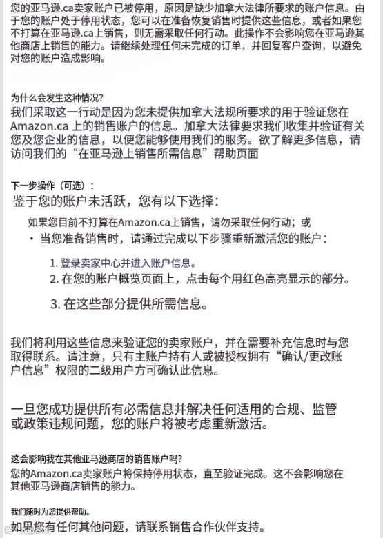 系统检测到 Amazon.com.br 或加拿大站长期无销售记录。为准备您的首次销售,请更新身份信息、收款方式等必要资料,完成验证后即可重新激活账户。
