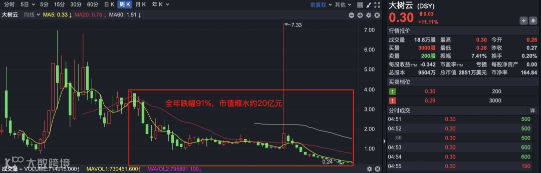 2026年开年,纳斯达克“个人护理第一股”大树云(DSY.US)宣布拓展AI业务线并组建核心技术团队。消息发布后盘前股价一度涨超10%,但截至1月2日收盘仅微涨8.26%至0.295美元/股,仍远低于纳斯达克1美元的最低合规线。