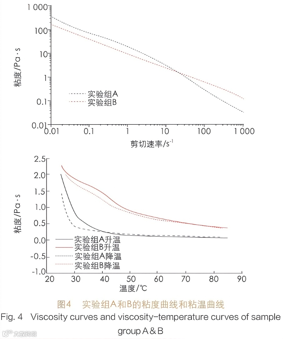 流变曲线显示两组均为假塑性流体。当剪切速率>18.75 s⁻¹时,B组粘度反超A组,体现更优长流变性;升温至85℃过程中,B组粘度下降更缓,证实其耐高温性更强。
