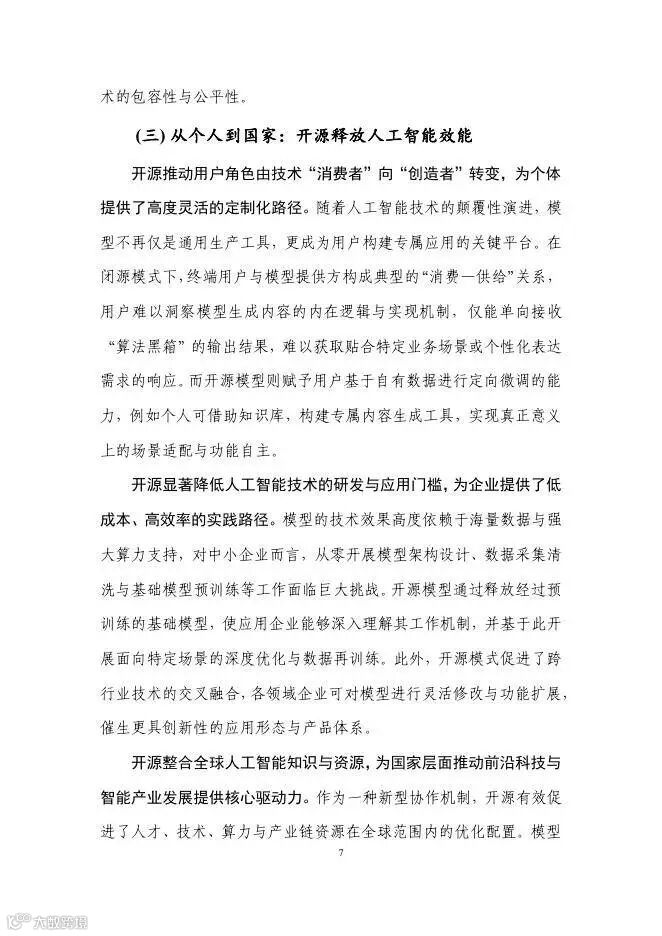 开源作为一种开放协作的范式,已从传统软件扩展至开源硬件、开放数据及开源大模型等多元形态,其核心在于打破技术壁垒,构建资源共享与协同创新机制。相比闭源模式,开源不仅重塑了人工智能产业生态,更在个人、企业及国家层面拓展了技术自主与应用创新的空间。