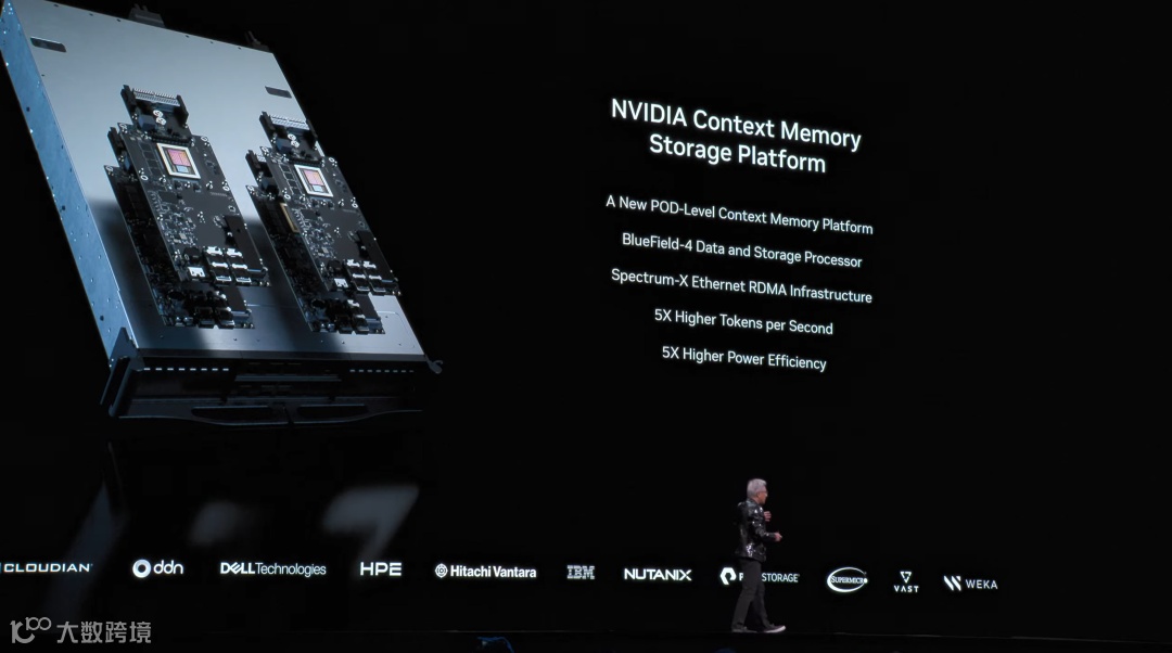 - BlueField-4 DPU:专为AI上下文记忆管理设计,卸载网络、存储与安全任务;