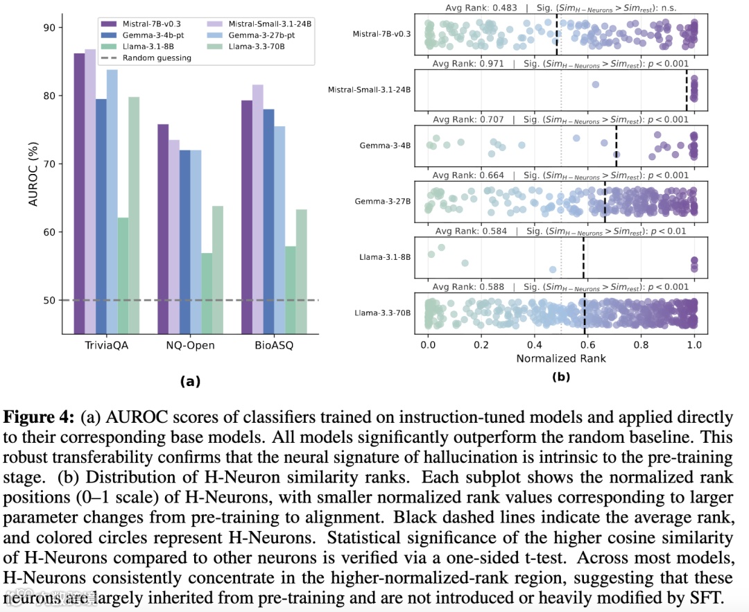 通过对比基础模型(Base Model)与指令微调模型(SFT),研究证实:H-神经元在基础模型中已具备稳定幻觉预测能力;其参数在 SFT 过程中更新极少,归一化排名分布高度一致。这说明幻觉倾向并非后训练对齐所引入,而是预训练阶段即形成的底层表示缺陷。