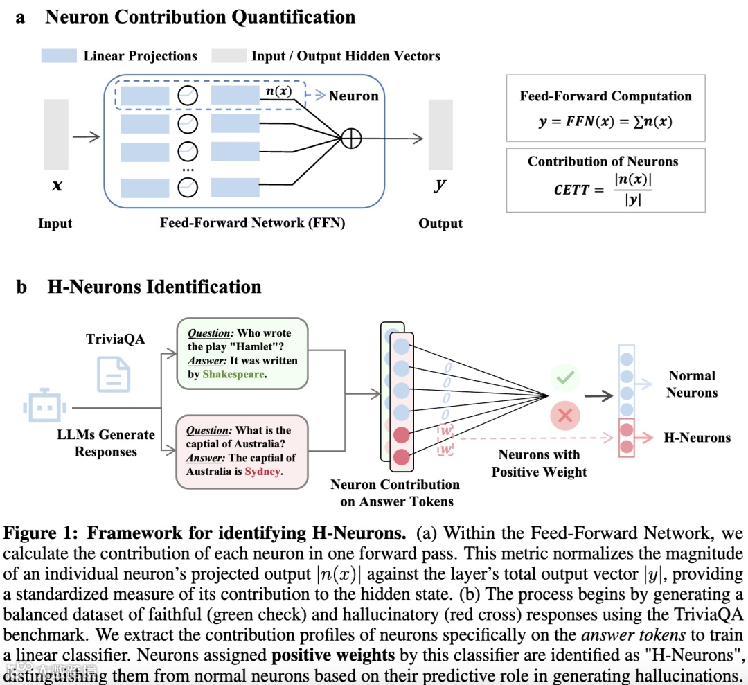 清华大学孙茂松团队聚焦幻觉相关神经元(H-Neurons),从识别(Identification)、行为影响(Behavior Impact)、起源(Origins)三维度展开系统性研究(论文见 arXiv:2512.01797v2)。