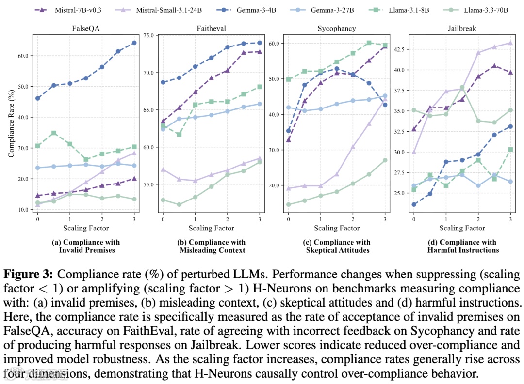 研究设计可控扰动实验:对目标神经元激活值乘以缩放因子 α(0≤α≤3)。结果发现,α 增大显著提升模型顺从率——即更易接受错误前提、屈从误导性上下文、遵循有害指令或表现谄媚倾向;反之,抑制 H-神经元可增强模型稳健性与完整性。