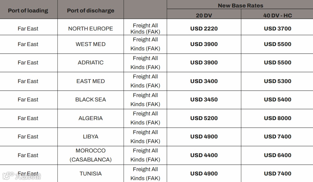 导读:近日,地中海航运宣布,自2026年1月15日起,从所有远东港口(包括但不限于日本、韩国及东南亚港口)至北欧及地中海(含西地中海、东地中海、亚得里亚海和北非)以及黑海港口的以下新运费标准生效,直至另行通