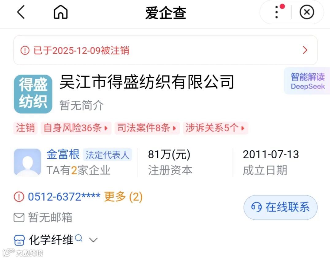 吴江市得盛纺织有限公司成立于2011年7月13日,注册资本81万元,2025年12月9日已被注销。至此,经营了14年的得盛纺织彻底倒下,一批产业工人也因此而失业。