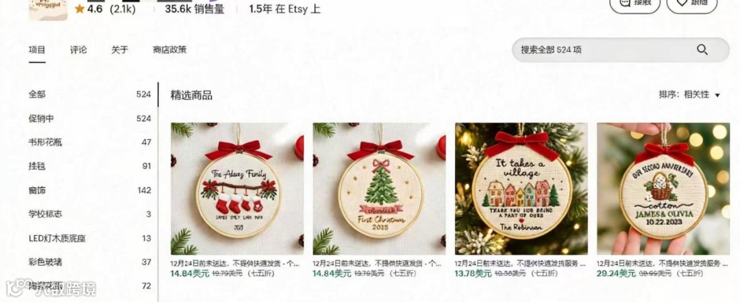 于是开启了我的兼职之路,白天上班,晚上就研究跨境电商,首先要解决的就是选品问题,结合Etsy主打原创、手工、复古的平台定位,再考虑到运输便利性,我最终选定了原创手工刺绣饰品和圣诞摆件这两个品类——这类商品受众精准,Etsy平台上的用户对原创设计接受度高,且单品体积小、重量轻,跨境运输成本低、不易损坏。