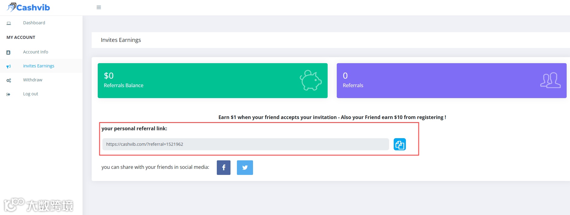 除了看广告,我们还可以通过邀请计划来赚取佣金,成功邀请一个新账户可以赚取 1 美元。