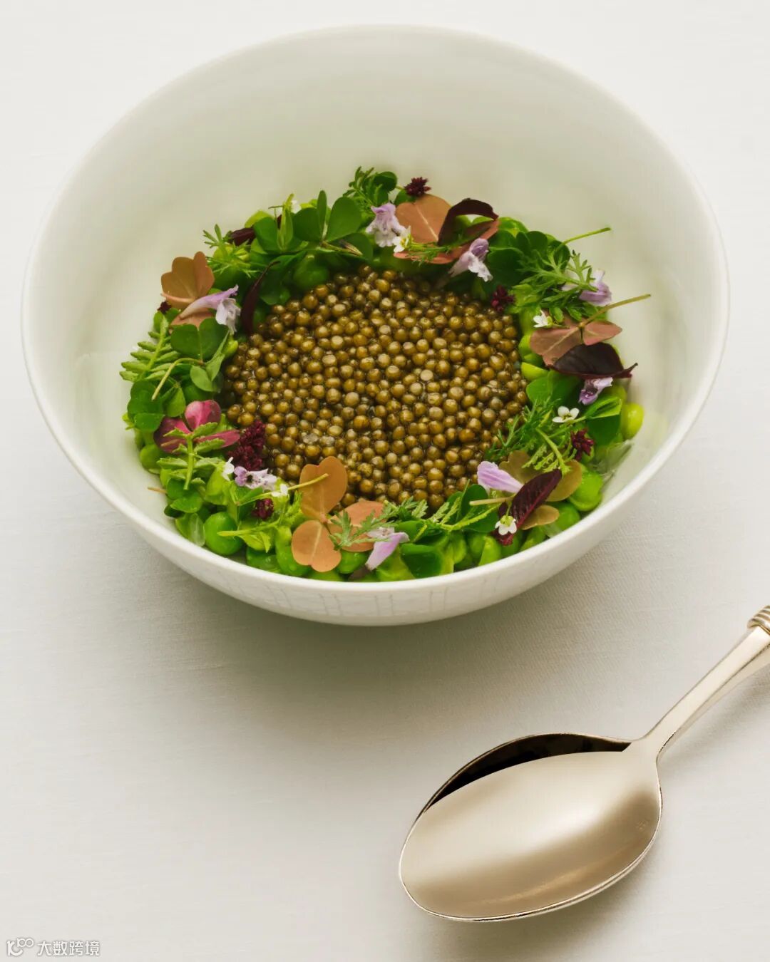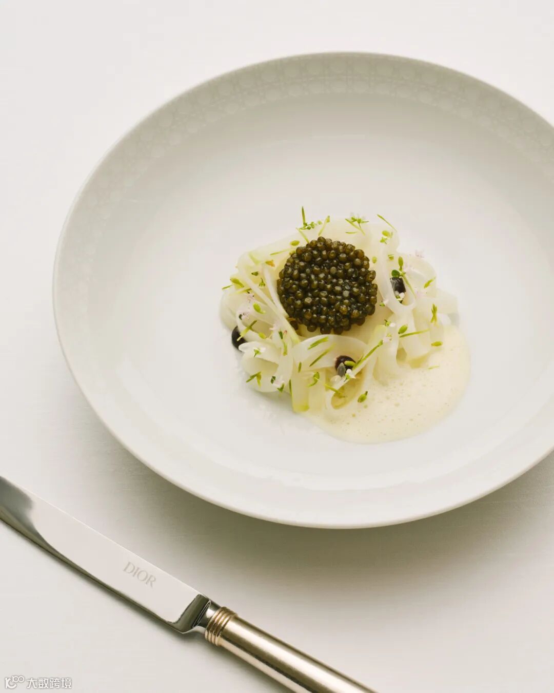 招牌菜品“珠饰(Les Perles)”以云南鱼子酱与鲜甜蟹肉为主角,搭配本地豌豆呈现色彩与质地的层次;豹纹三角折饺(Les Berlingots)用清淡奶酪替代传统馅料,致敬迪奥灵感缪斯Mizza Bricard;千层酥则融合Miss Dior香水中千鸟格纹与东方茶韵,实现三重共鸣——个人情感、在地风土与品牌基因。