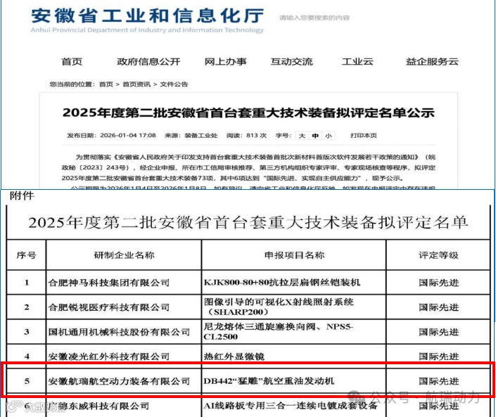 2026年1月4日,安徽省工信厅发布《2025年度第二批首台套重大装备评定名单》,共73项装备入选,其中6项达到国际先进水平。航瑞公司DB442“猛雕”航空重油发动机成功获评国际先进等级。