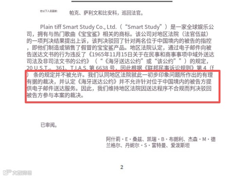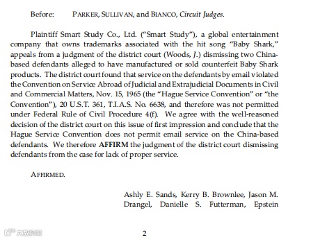 近期,美国联邦第二巡回上诉法院在【Smart Study Co., Ltd.】鲨鱼宝宝(Baby Shark)商标维权案中作出关键判决,明确认定:向中国被告通过电子邮件送达法律文书,违反《海牙送达公约》,属不合法送达。