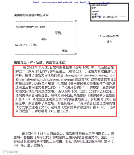 两名中国被告提出抗辩,主张美国法院缺乏属人管辖权,理由是:电子邮件送达违反《海牙送达公约》,亦不符合《联邦民事诉讼规则》第4(f)条。