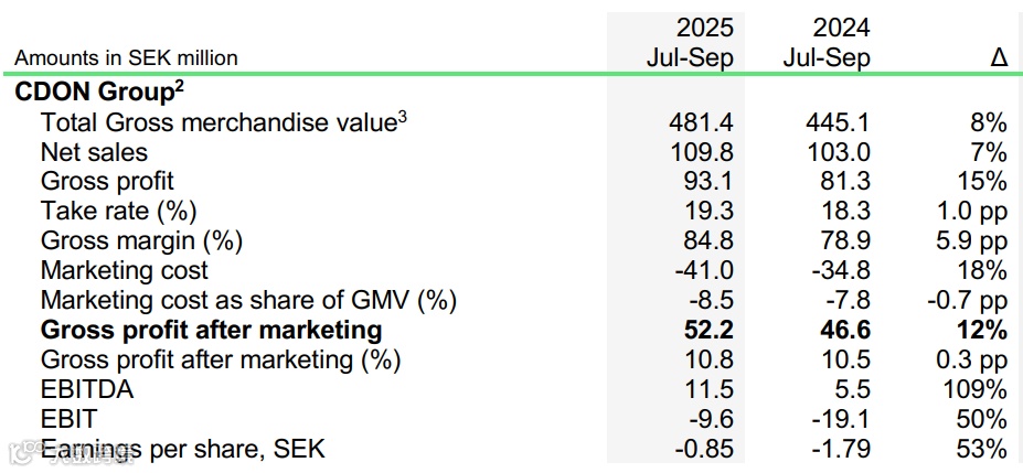 CDON收紧招商标准的核心动因,在于对盈利能力的刚性追求。2025财年Q3财报显示:GMV同比增长8%,调整后EBITDA利润率提升至10.5%。该成绩主要得益于高毛利品类(如品牌电子、家居)的结构性增长及运营效率优化。