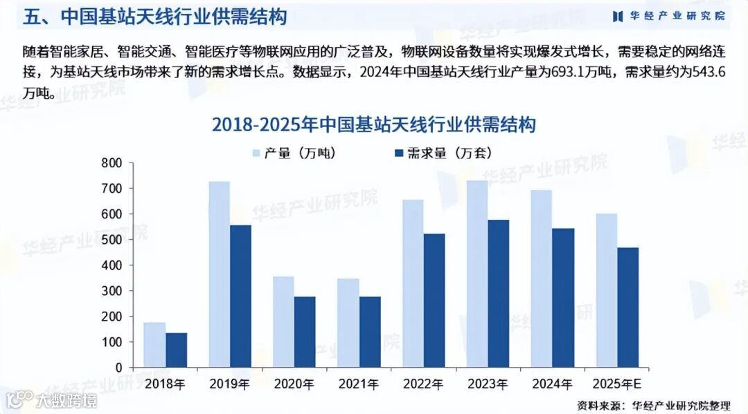 2024年,中国基站天线行业市场规模达112.21亿元;产量为693.1万吨,需求量为543.6万吨。消费升级带动移动数据流量爆发式增长,宏站、微站及小基站加速部署,进一步拉动天线技术向多频段、高增益、智能化方向演进。