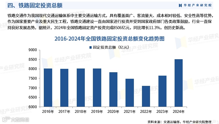 作为国家公共交通与基建关键环节,轨道交通持续获中央及地方政策强力支持。2024年全国铁路固定资产投资达8506亿元,同比增长11.3%,创历史新高。