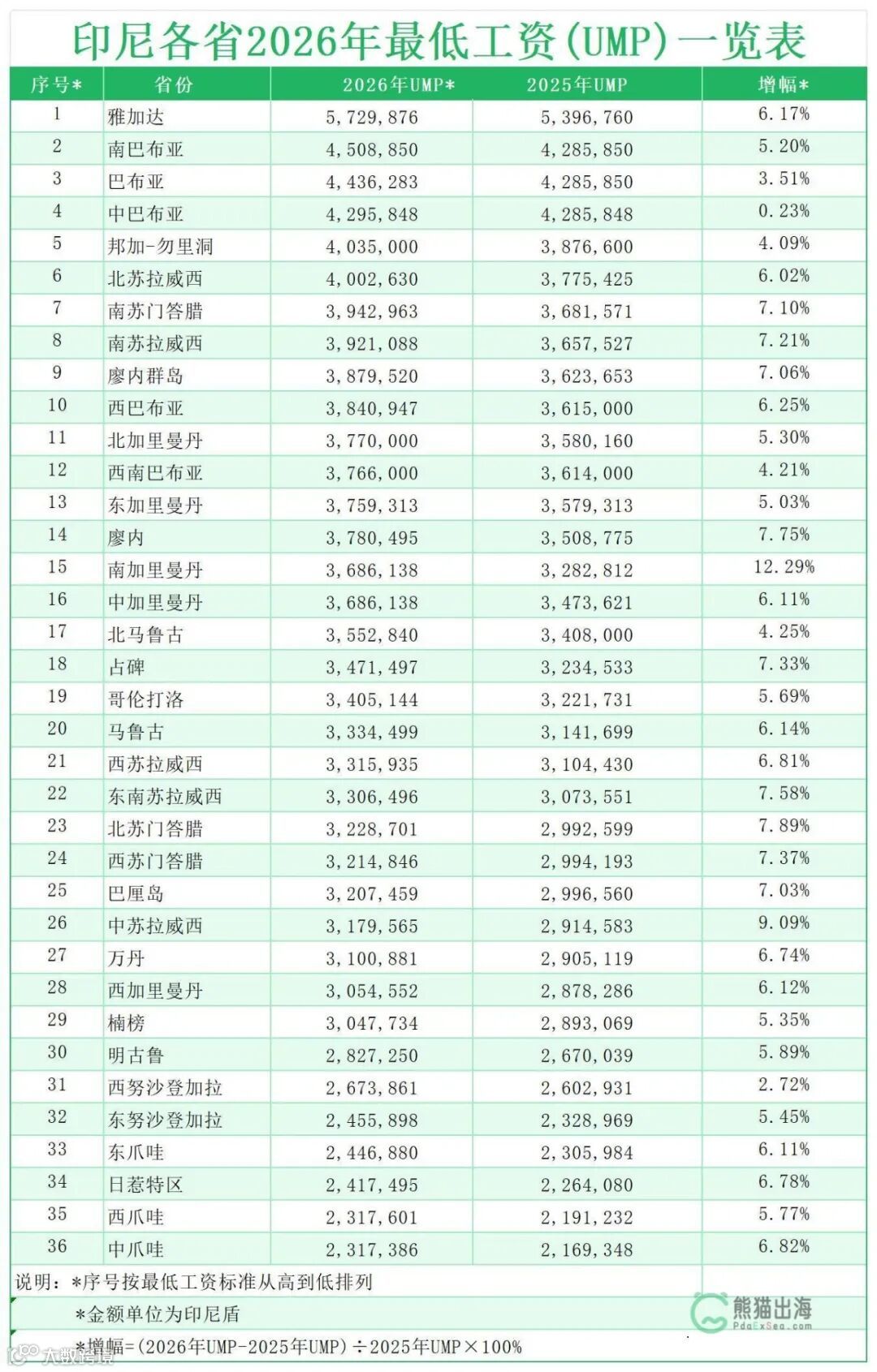 2026 年印尼 36 省最低工资表格(建议收藏)