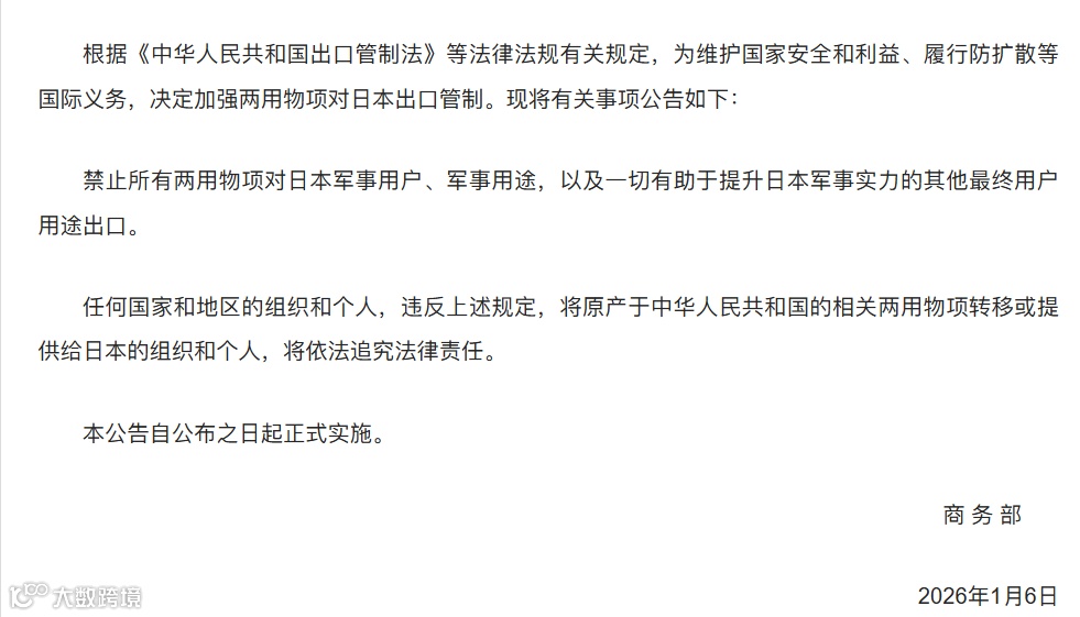 根据《中华人民共和国出口管制法》等法律法规有关规定,为维护国家安全和利益、履行防扩散等国际义务,决定加强两用物项对日本出口管制。