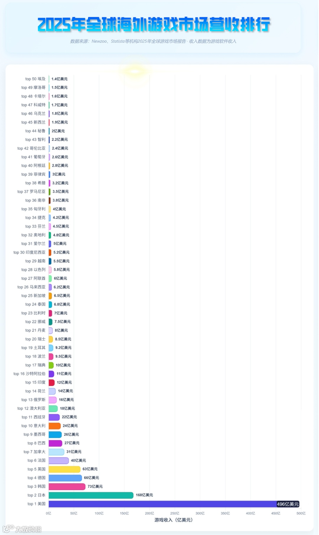 在庞大的海外游戏市场中,美国以 496 亿美元的收入位居榜首,仅次于中国游戏市场收入 498 亿美元。