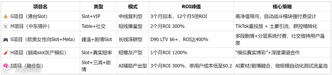 ❶ Slot + Meta(建设/剧情) → 强留存 + 女性用户群 → VIP订阅 + 资源限制付费点 → Facebook老用户买量 + 社交推荐 → ARPU $1.5~$2.3,LTV 90天 → $6.5+ → 适合中线稳定拉爆,一年ROI超300%