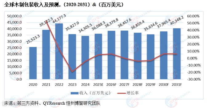 全球木制包装市场规模呈现稳步扩张的态势,2024年全球市场规模约34,305.5百万美元,2020-2024年年复合增长率CAGR约为7.67%,预计未来将持续保持平稳增长的态势,到2031年市场规模将接近40,348.2百万美元,未来六年CAGR为1.88%。