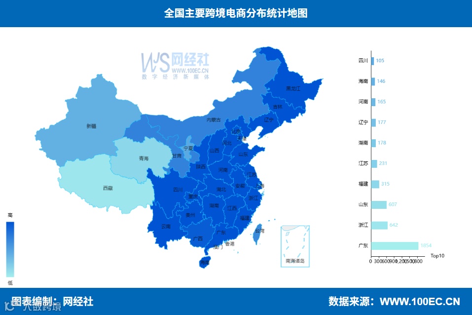 网经社企业库(COP.100EC.CN)发布的《全国主要跨境电商公司分布统计地图》上,跨境电商企业共有4420家。中国跨境电商分布高度集中,主要集中于东部沿海地区。广东省以1854家绝对领先,浙江省(642家)、山东省(607家)和福建省(315家)紧随其后。