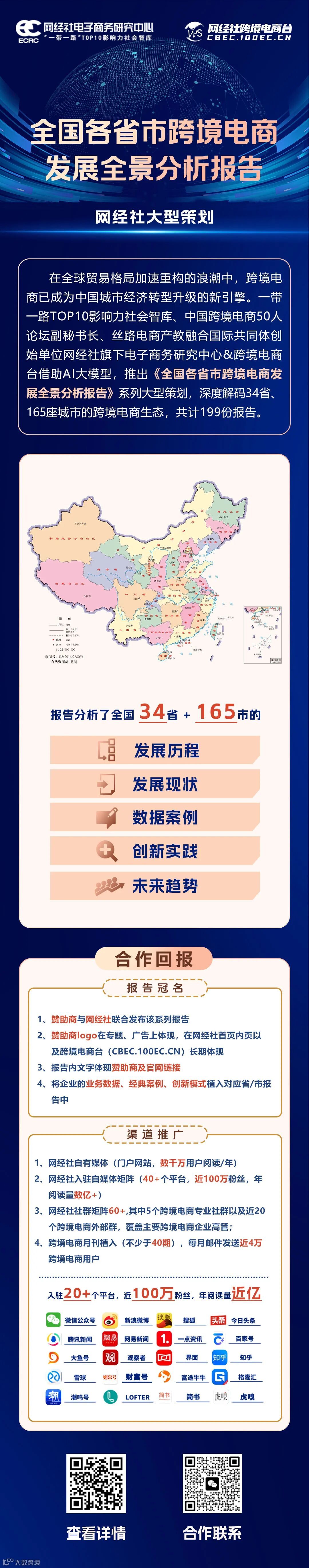 导读:借助AI大模型,“一带一路”TOP10影响力社会智库网经社电子商务研究中心推出《全国各省市跨境电商发展全景分析报告》大型策划(详见 #网经社 专题:https://www.100ec.cn/zt/dskdfx/),通过发展历程、发展现状、数据案例、创新实践、未来趋势等维度深度解码34省、165座城市的跨境电商生态,共计199份报告。